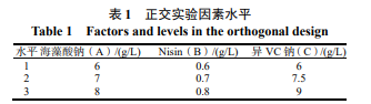 在單因素實驗 基礎上將 3 種保鮮劑復合,采用 3 因素 3 水平的正 交實驗,研究復合保鮮劑的最佳配比。海藻酸鈉、 Nisin、異 VC 鈉的水平取值范圍見表 1。