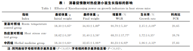 與室溫對照組相比,熱應激對照組增重率極顯著 降低(P<0.01),中藥組增重率顯著降低(P<0.05), 其中中藥組增重率顯著高于熱應激對照組;室溫對照 組的生長率顯著高于熱應激組(P<0.05),但與中藥 組差異不顯著(P>0.05);熱應激對照組的飼料轉化 率均高于室溫對照組和中藥組(表1)。