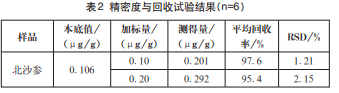 準確稱取適量的北沙參樣品,并在樣品中分別加入硒標準 溶液,按本實驗方法進行消解、定容,進行加標回收試驗,計算 出測定結果的相對標準偏差和回收率,結果見表2。由表2可知,方法的加標回收率為95.4%~97.6%,RSD為 1.21%~2.15 %,表明該方法具有較好的精密度和準確度。