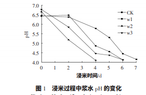 稱取糯米加入清水,接入活化的乳酸菌(使乳酸 菌終濃度為 105 CFU/mL),接入試驗設置乳酸菌 w1、 乳酸菌 w2、乳酸菌 w3 和對照(CK)4 組處理,對照組 未接菌但加入同樣體積的生理鹽水。置于 18 ℃的培 養(yǎng)箱中浸泡,監(jiān)測并記錄浸米漿水的 pH,待漿水 pH 降至 4.2 左右時,停止浸米。