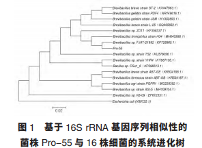 16S rRNA 基因測序, 所獲得的序列長度為 1438 bp, 將 Pro-55 的 16S rRNA 基因 序 列 與 GenBank 數 據庫中的序列進行同源性比對,發現 Pro-55 與短 芽 孢 桿 菌 屬 的 16S rRNA 基 因 序 列 自 然 聚 類 , Pro-55 的 16S rRNA 基因序列與 16 條相似性較 高的序列構建系統發育樹見圖 1, 從圖中可以看 出 Pro -55 與 Brevibacillus sp. FJAT -21992 (KP728965.1)菌株聚為一群,相似性也最高,表明 Pro-55 與 Brevibacillus sp.的菌株親緣關系最近。 根據 Pro-55 的形態及生理生化特征, 結合 《伯杰氏細菌鑒定手冊》(第八版)(布坎南,1984), 以及 Pro-55 16S rRNA 基因序列及系統發育樹, 將 Pro-55 初步鑒定為短芽 孢桿菌屬(Brevibacillus sp.) 的一 株 菌, 命 名 為 Brevibacillus sp.Pro