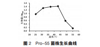 根據水解圈直徑與菌落 直徑比值的大小。篩選到 3 株產高溫蛋白酶菌株。 其中 1 號菌株 水解圈直徑 與 菌 落 直 徑 比 值(R1/ R2)最大。 經復篩發現 3 株菌均為分泌型蛋白酶 產生菌,且 1 號菌株酶活最高,為 49.99 U/mL,與 初篩的結果相符。因此,選擇 1 號菌株作為后續試 驗研究菌株,命名為 Pro-55。