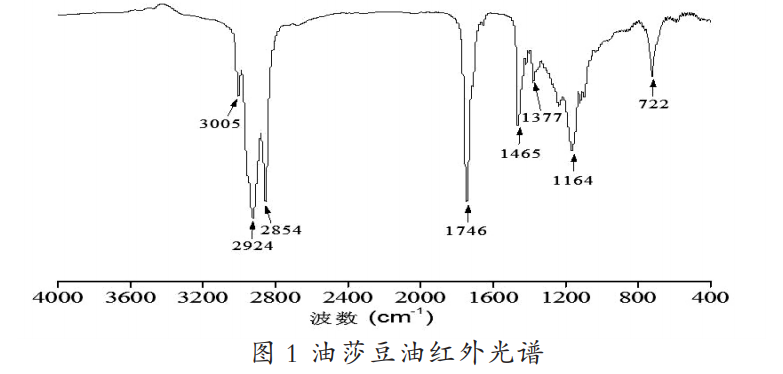 圖 1 為油莎豆油紅外光譜,波數 3005cm-1 吸收峰對應于 不飽和 C=C 雙鍵中 =C-H 的伸縮振動,2924cm-1 和 2854cm-1 吸收峰則歸屬于油中甲基和亞甲基 C-H 的反伸縮振動和伸 縮振動。而 1746cm-1 處典型的吸收峰則是酯基中 C=O 伸縮振 動,甲基和亞甲基的彎曲振動則分別出現在波數 1465cm-1 和 1377cm-1 位置,波數 1164cm-1 吸收峰表明酯基中 -C-O 的伸 縮振動,722cm-1 處較強的銳鋒則是歸因于順式 C=C 的面外 彎曲和亞甲基的平面搖擺疊加。通過紅外光譜,得出油脂基團 及化學鍵的相關信息,可對油莎豆油結構進行定性分析。