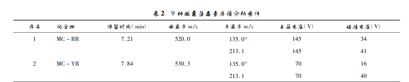 色譜柱 ACQUITY UPLC BEH C18 2. 1 mm × 100 mm,1. 7 μm Column,流動相: A: 0. 04% 甲 酸 水 溶 液,B: 甲 醇,洗脫梯度程序件 表 1。流速: 0. 20 ml /min; 柱溫: 40 ℃ ; 進樣量: 10 μl。 電噴霧離子源( ESI,正離子掃描; 掃描方式,多反應監 測 MRM) 。氣 簾 氣 ( CUR) ,35 psi; 霧化 氣 ( GS1 ) , 50 psi; 輔助氣( GS2) ,50 psi; 電噴霧電壓( IS) ,5 500 V; 碰撞氣( CAD) ,medium; 離子源溫度( TEM) ,550. 0 ℃。 特征離子見表 2。