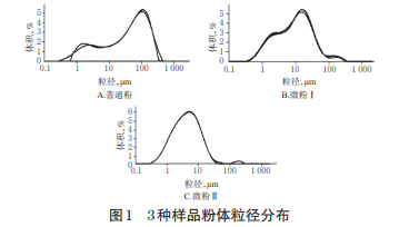 分別稱取“2.1”項(xiàng)下 3 種樣品約 1 g,采用激光粒度 分析儀測定其粒徑,平行測定3次,取平均值,結(jié)果見表 1(d0.1、d0.5、d0.9分別表示小于某粒徑的微粒在全微粒群中 的質(zhì)量分?jǐn)?shù)為10%、50%、90%),其粉體粒徑分布見圖 1。由表1、圖1可見,牡蠣殼經(jīng)過超微粉碎后,微粉Ⅰ和 微粉Ⅱ的d0.1、d0.5、d0.9顯著小于普通粉,且粒徑分布趨于 均勻,大部分微粉Ⅱ粒徑達(dá)到了超微粉體粒徑不得超過10 μm的要求 。