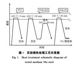 實驗材料為工業試制的0.1C-5Mn鋼熱軋鋼板 (厚6.0mm),其化學成分(質量分數,%)為:C0.1, Mn5.0,Si0.01,Fe余量。通過 Thermal-Calc軟件 (TCFE8數據庫)計算了實驗鋼 Ae1和 Ae3溫度分別 為610℃和740℃。對該熱軋板在實驗室電阻爐中 進行650℃的兩相區退火處理,保溫時間分別為5 min(編號為 TG7)和30min(編號為 TG8),隨后空 冷至室溫。為了模擬鋼板表面處理過程中溫度升高 的影響,將一部分退火30min的試樣加熱到500℃ 進行回火處理,保溫時間為60min,隨后空冷(編號 為 TG8-500)。此外,為考察變形后中錳鋼的氫脆敏 感性,將其余的退火30min試樣沿著鋼板軋制方向 取板狀拉伸試樣(寬度5mm、厚度1.5mm、標距15 mm),在 SUNS/UTE5305 型 材 料 試 驗 機 上 進 行 5%預變 形,拉 伸 速 率 為 1mm/min(編 號 為 TG8- 5%)。上述實 驗 鋼 的 處 理 工 藝 如 圖 1 所 示。對 于 TG7及 TG8-500樣,沿著鋼板軋制方向取板狀拉伸 試樣(寬度5mm、厚度1.5mm、標距15mm)。