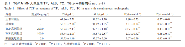 見表 1。與正常對照組比較,模型 組大鼠血清中 TP、ALB 含量顯著降低(P < 0.01), TC、TG 含量顯著升高(P < 0.01);與模型組比較, TGP 高、低劑量組和醋酸潑尼松組大鼠血清中 TP、 ALB 含量顯著升高(P < 0.05,P < 0.01),TC、TG 含 量顯著降低(P < 0.01)。