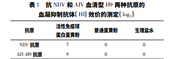 抗 NDV 和 AIV 血清型 H9 抗原血凝抑制抗體 ( HI) 效價的測定( log2 ) 如表 1,結果顯示: 活性免疫 球蛋白蛋黃粉對 NDV 和 AIV 血清型 H9 兩種抗原 的血凝抑制抗體( HI) 效價均很高,分別為達到 log2 的 7 和 9,但在普通蛋黃粉和生理鹽水對照組均未 檢測到抗體( 表 1) 。