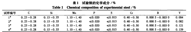 1 5 0 kg 中 頻真 空感應(yīng) 爐 冶 煉 —澆 鑄成 5 0 k g 鋼 錠—鋼錠去 保溫 帽及尾部—箱式電阻爐(上海博迅SX2-2.5-10Z)加熱 ( 加 熱溫度為 1 200 丈 , 保溫 1 h ) —軋制 成 1 2 m m 厚扁 鋼 ( 4>75 0 mm + 055 0 mm 兩輥乳機(jī) ) 一 > ■ 乳后 自 然空冷 。 采用 以 上方法制 得的 試驗(yàn)鋼主要化學(xué)成分見(jiàn)表 1 , 其中 1 # 試樣 為 現(xiàn) 有 25 CrM nB 履帶 板鋼的 化學(xué)成 分 , 作為 對(duì) 比 鋼 , 鋼 中 的 釩 為 試驗(yàn)原料 的 殘余 釩 ; 2 #  ̄ 4 # 試樣除 釩含量有 所變 化外 , 其余元素 含量基 本相 當(dāng) 。