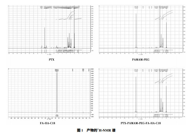 用磁共振氫譜( 1 H-NMR 譜) 對(duì)合成所得產(chǎn)物的結(jié)構(gòu)進(jìn)行表征, PTX、PAMAM-PEG、FA-HA-C18 的特征峰說(shuō)明成功地將三組分引入到 PTX-PAMAM-PEG-FA-HA-C18 結(jié)構(gòu)中。見(jiàn)圖 1。