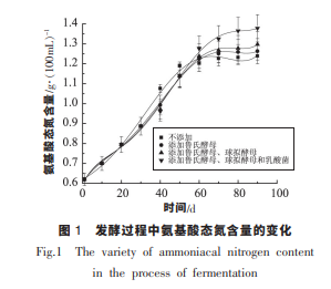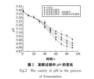 由圖 1 可知, 發(fā)酵 90 d, Ⅳ組添加了魯氏酵 母、 球擬酵母和乳酸菌制曲的醬油氨基酸態(tài)氮含 量最高,可達(dá)到 1.38 g/100 mL,Ⅰ組最低。 在發(fā)酵 過(guò)程中氨基酸態(tài)氮的含量趨勢(shì)呈現(xiàn)先增加后平 穩(wěn)。 在 50 d 以前,對(duì)照組高于試驗(yàn)組,50 d 后對(duì)照 組中的氨基酸態(tài)氮含量基本趨于平穩(wěn)。 而試驗(yàn)組 中的氨基酸態(tài)氮在前 60 d 一直保持上升趨勢(shì),直 至 60 d 時(shí)才趨于平穩(wěn)。 這是由于添加魯氏酵母與 球擬酵母后,在前期酵母大量繁殖,消耗較多氨基 酸。 因此在 30~50 d 時(shí),試驗(yàn)組中的氨基酸態(tài)氮低 于對(duì)照組。 而 50 d 后,由于對(duì)照組中的氨基酸與 糖類發(fā)生美拉德反應(yīng)消耗氨基酸, 而試驗(yàn)組中的 這一過(guò)程發(fā)生在 60 d 后。由圖 2 可知,pH 呈現(xiàn)出不斷下降的趨勢(shì),這 是由于在發(fā)酵過(guò)程中, 由于醬油中有機(jī)酸的不斷 產(chǎn)生。明顯可以看出,pH 下降最快的為Ⅳ組。這是 由于Ⅳ組添加了乳酸菌,乳酸菌可以利用糖類、檸 檬酸生成乳酸和醋酸, 從而產(chǎn)生以上現(xiàn)象。 并且pH 下降至 5 附近, 抑制了非耐酸雜菌的生長(zhǎng),同 時(shí)促進(jìn)酵母的繁殖與發(fā)酵。 另外,酸性物質(zhì)賦予了 醬油爽適的風(fēng)味,改善醬油的口感。 并且酸性物質(zhì) 的生成抑制了非耐酸微生物的繁殖, 但可以促進(jìn) 醬油酵母的生長(zhǎng)與繁殖,以及酒精發(fā)酵。由圖 3 可知,在發(fā)酵過(guò)程中,還原糖的含量呈 現(xiàn)先增加后減少的現(xiàn)象。 這是由于制曲時(shí)積累的 淀粉酶作用下,還原糖含量上升,和可利用多糖的 釋放。 而后期,由于美拉德反應(yīng)以及微生物代謝 消耗還原糖,導(dǎo)致還原糖含量下降。