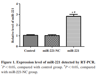 轉(zhuǎn)染后各組 ALL細胞的 miR-221水平 miR-221 組的 miR-221 的表達水平顯著高于對照組 及 miR-221-NC 組(P< 0.05)(圖 1)。