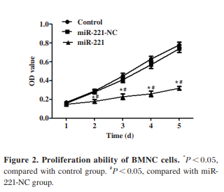 轉(zhuǎn)染后 ALL 細胞增殖水平的變化 轉(zhuǎn)染 2、3、4 和 5 d 后,miR-221 組 BMNC 細胞增 殖水平顯著低于對照組及miR-221-NC組(P< 0.05) (圖 2)。