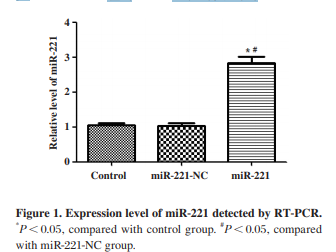 轉染后各組 ALL細胞的 miR-221水平 miR-221 組的 miR-221 的表達水平顯著高于對照組 及 miR-221-NC 組(P< 0.05)(圖 1)。