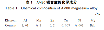 采用商用 AM80鎂合金鑄錠為原材料,其化學 成分如 表1所 示。將 AM80鎂 合 金 鑄 錠 切 割 成 邊 長為12mm 的正 方 體 和71mm×18mm×18mm 的長方體試樣,在井式坩堝電阻爐中進行熱處理,并 用石墨粉覆蓋試樣,防止氧化。