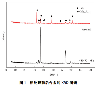 圖1為退火處理前后試樣的 XRD 譜圖。由圖 1可見,AM80鑄態合金由α-Mg基體和β-Mg17Al12相 組成,Mn和Zn含量較低,未能標出。經過430 ℃退 火處理6h后的相組成與鑄態相同。這是因為在退 火保溫過程中部分第二相溶入基體,在隨爐冷卻過 程中溶入基體的第二相又重新析出,因此退火前后 相組成相同。